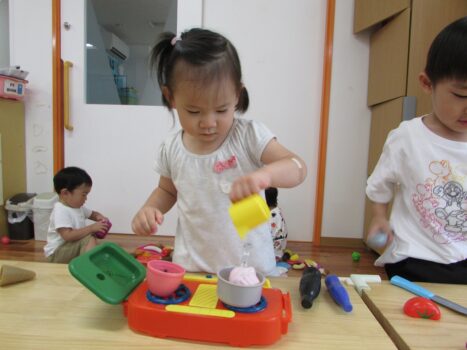 2歳児クラスも中盤になり、子ども達は自由遊びが上手になってきました。グロック遊びのエリア、おままごとエリア、電車エリア、工事エリアなどを教室に作ってあげると、子ども達は各々好きなエリアに行った自由に遊びます。遊び方も想像力の成長とともに、多種多様になってきました。遊びの中から学ぶことも沢山ありますね。